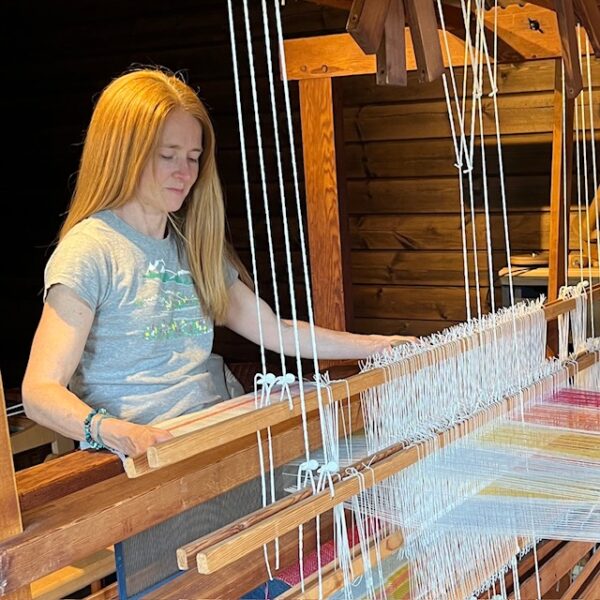 She works on a 16 shaft table loom and a restored 100 year old countermarche loom at home in her garden studio.