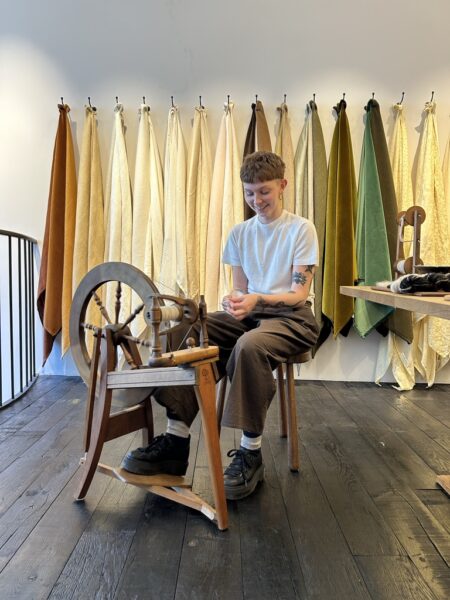 Scarlett Farrer is a woven textile designer specialising in handwoven fabrics and hand spun yarns. Her work focuses on sustainable, ethical and traditional practices from the sourcing of local wool and fleeces, through to the processing stages of the raw fleeces, to the weaving and finishing of the fabrics.